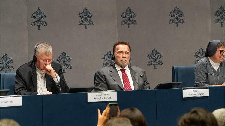 El cardenal Jaime Spengler, presidente del episcopado brasileño y del Celam, Lorna Gold, directora ejecutiva del Movimiento Laudato Si; el actor Arnold Schwarzenegger, exgobernador de California, Maina Talia, ministro de Interior, Cambio Climático y Medio Ambiente de Tuvalu y la hermana Alessandra Smerilli, subsecretaria del Dicasterio para el Desarrollo Humano Integral, presentaron, la "Conferencia Internacional Brindando Esperanza", en el marco del décimo aniversario de la encíclica Laudato Si', el Año Jubilar y la conmemoración de los diez años del Acuerdo de París.