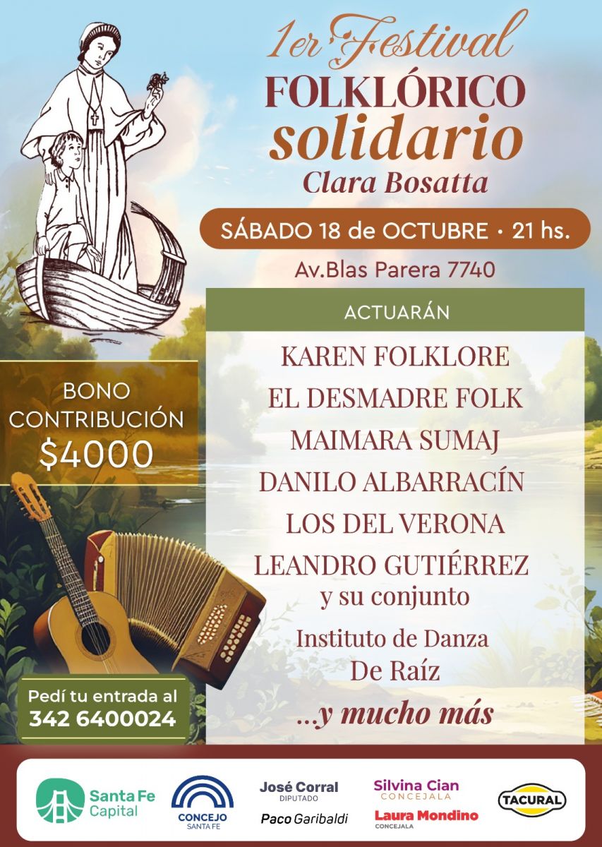 "Nos vamos a sumar este sábado al festival Solidario Clara Bosatta que se realiza en Santa Fe y es una idea de Gabriela Roldán. Allí estaremos después de las 20,30 junto a otros grupos como Karen Folklore, Los del Verona, Danilo Albarracín y Leandro Gutierrez entre otros. Esta institución ubicada en Blas Parera 7740 lleva adelante una gran obra educativa y este festival es un beneficio muy importante para respaldar las actividades que hacen durante todo el año, y es con una entrada muy accesible para todos".