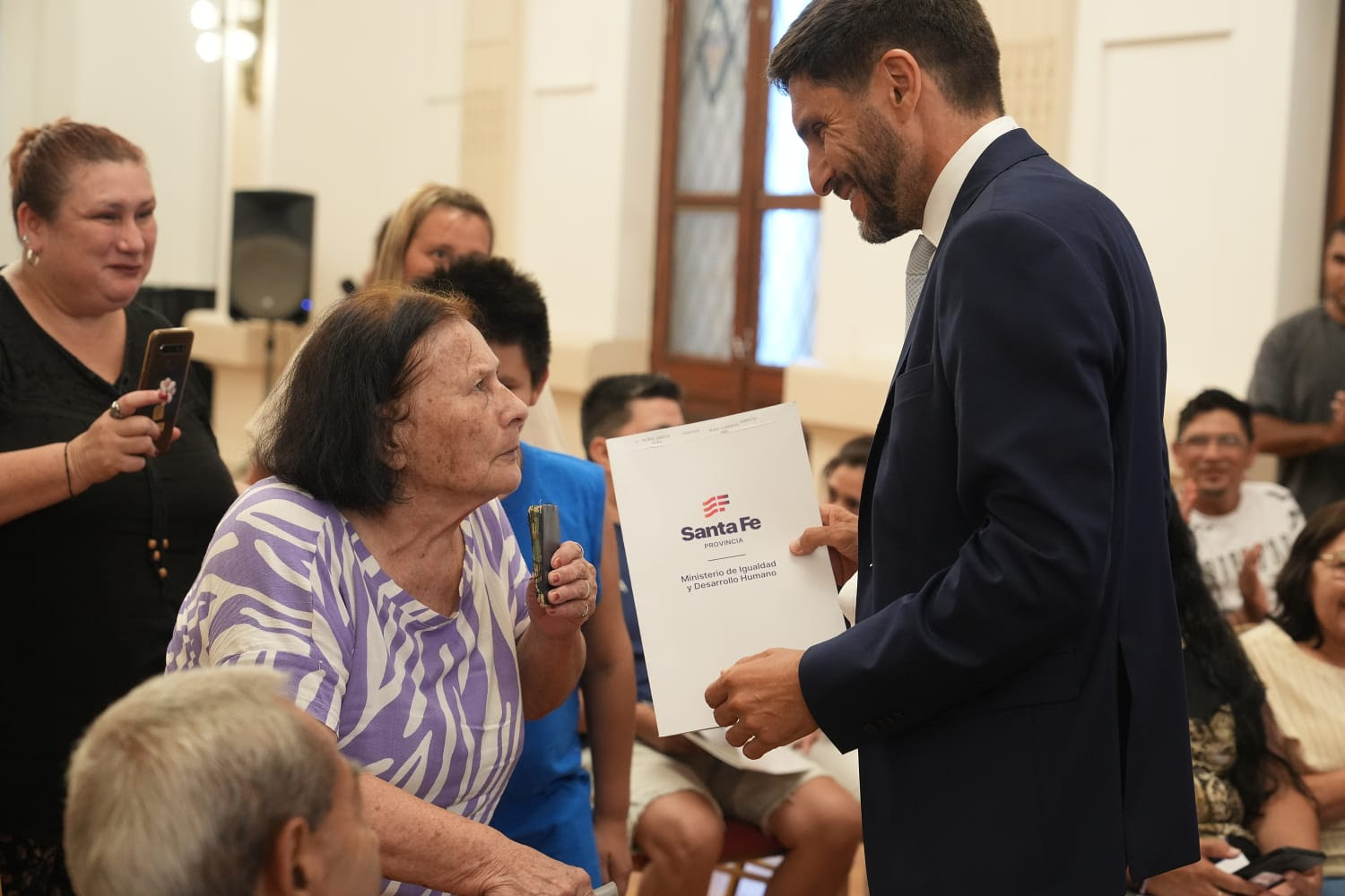 El gobernador de la provincia de Santa Fe, Maximiliano Pullaro, entregó este miércoles 19 escrituras a vecinos y vecinas de la ciudad capital, en un acto realizado en el Salón Blanco de Casa de Gobierno. Los títulos de propiedad fueron gestionados a través de la Dirección de Regularización Dominial del Ministerio de Igualdad y Desarrollo Humano, en el marco de las políticas provinciales de acceso a la vivienda y seguridad jurídica.