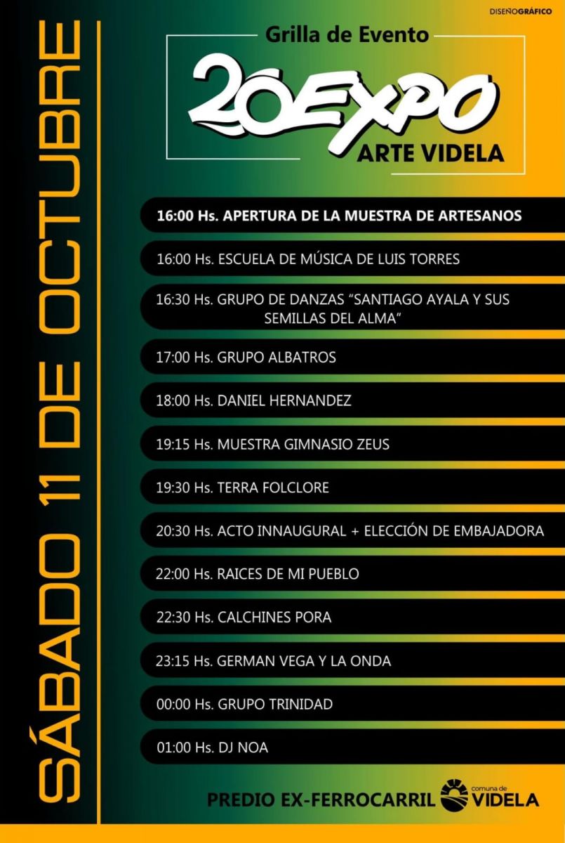 La Expo Arte de Videla es organizada por la comuna que encabeza José Noseda, con el auspicio del senador Rodrigo Borla y del gobierno provincial, y se realiza este sábado 11 y domingo 12 de octubre en el predio del ferrocarril ubicado a la vera de la ruta nacional 11, con entrada libre y gratuita.