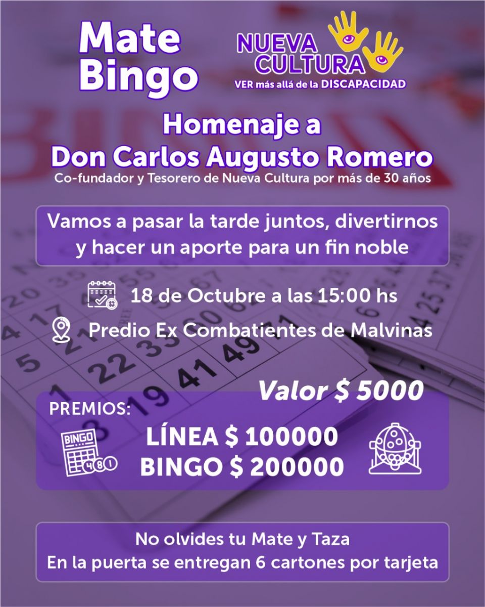 En cuanto al mate bingo del próximo sábado destacó que "hacemos este encuentro para honrarla memoria de Carlos Romero con un beneficio para nuestra institución que él tanto quiso y la idea es pasar la tarde juntos, divertirnos y hacer un aporte para un fin muy noble, con grandes premios para todos que debemos agradeces a empresarios y políticos que nos los han donado" concluyó en la tarde de la Nueva Nueve.
