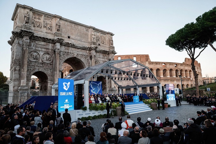 Tras un encuentro ecuménico al inicio de la ceremonia, y después de que representantes de diferentes religiones rezaran en distintos lugares, según sus propias tradiciones, todos convergieron en la plaza del Coliseo, reuniéndose en el escenario instalado frente al Arco de Constantino para la ceremonia final. Allí escucharon el testimonio de un refugiado sudanés, antes de un minuto de silencio por las víctimas de la guerra.