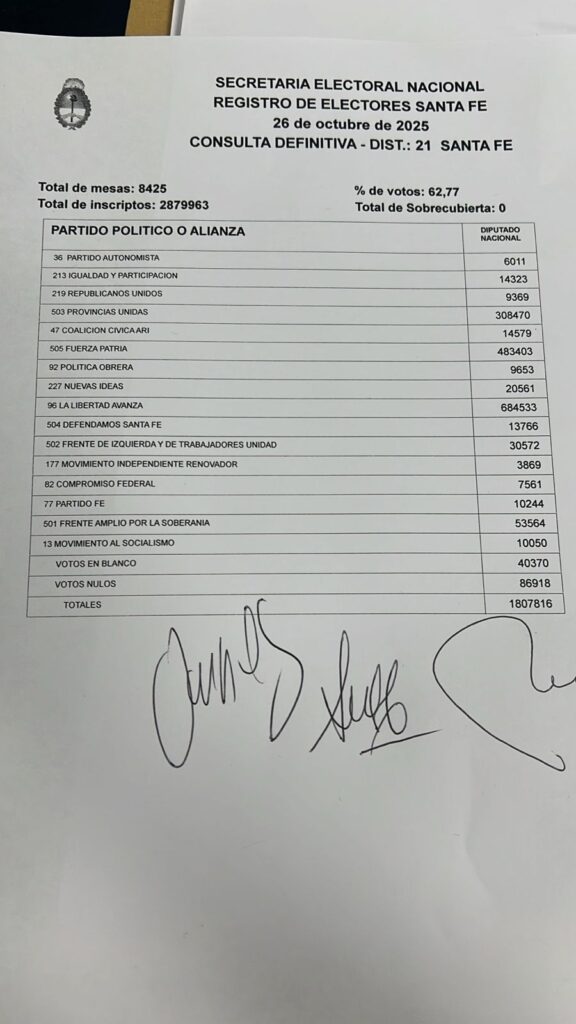 Este jueves finalizó el escrutinio definitivo en la provincia de Santa Fe de las elecciones legislativas nacionales del pasado domingo y no hubo grandes cambios en relación al recuento provisorio, que arrojó un claro triunfo de la Libertad Avanza, seguido por Fuerza Patria y relegando a Provincias Unidas al tercer lugar.