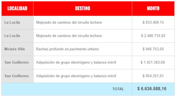 Localidades beneficiadas Luego de analizarse los expedientes puestos a consideración en el seno de la Comisión, se aprobaron -entre otros- las siguientes solicitudes de localidades del departamento San Cristóbal: